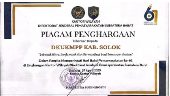 Koto Baru, DKUKMPP - Dinas Koperasi, Usaha Kecil Menengah, Perindustrian dan Perdagangan (DKUKMPP) Kabupaten Solok meraih penghargaan bergengsi sebagai “Mitra Berdampak dan Bermanfaat” dari Kantor Wilayah Direktorat Jenderal Pemasyarakatan (Ditjenpas) Sumatera Barat, Jumat (8/8/2025).